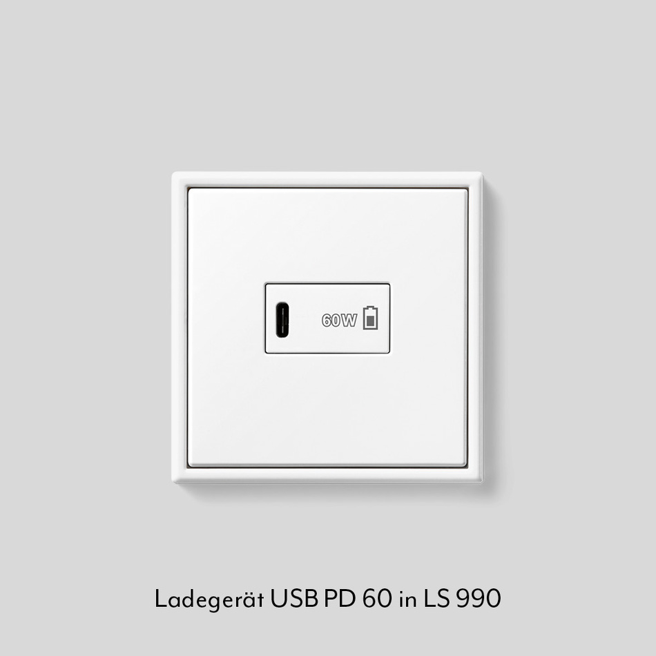 Ab Anfang 2026 sind USB-C-Anschlüsse für alle neuen Geräte Pflicht. JUNG bietet mit dem Ladegerät USB PD 60 eine platzsparende Lösung zum Laden von Akkus mit bis zu 60 Watt mit USB-C Port. Die Ladegeräte sind mit den Serien A, CD und LS kompatibel.